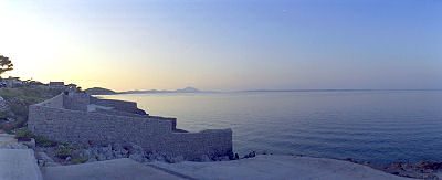 Panoramaansicht der Küste neben dem Kurbad - "Strand ohne Namen" ... :-) Der Strand im Ortsteil Rovenska ist der einzige stadtnahe Strand von Veli Losinj, der auch für Nichtschwimmer und Kleinkinder geeignet ist. Das Ufer fällt allmählich ab, sodaß man auch nach vier bis fünf Metern im Wasser noch stehen kann. Der Meeresgrund ist hier mit (glatten) großen Kieselsteinen bedeckt, so dass auch hier Badeschuhe dringend zu empfehlen sind. In dem Gebäude am Strand gibt es ein WC und Umkleidekabinen. In der Strandbar gibt es Getränke und kleine Snacks für zwischendurch. Für den großen Hunger kann man auch zwischendurch den Fischgaststätten im Hafen von Rovenska einen Besuch abstatten.